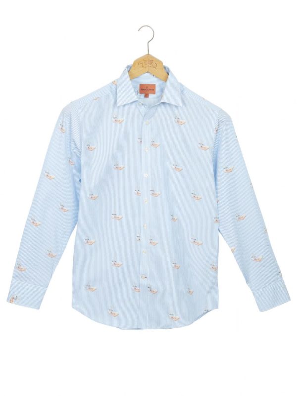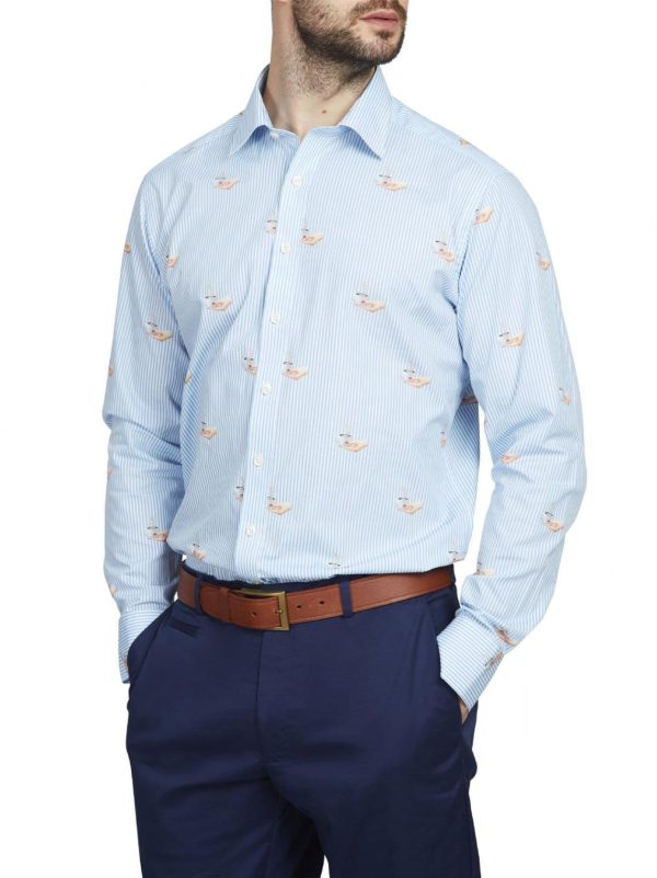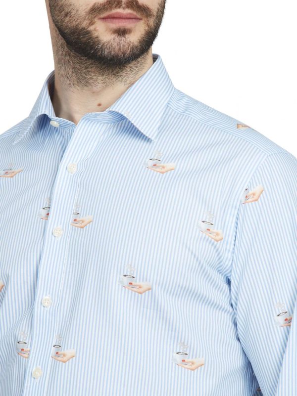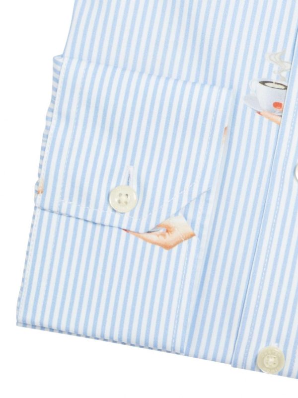 Cant start the day without your caffeine fix? Then we have the perfect shirt for you. A carefully manicured hand extends a gently steaming cup of fresh coffee from the stripes of the fabric. Theres a hint of surrealism here and I like the way that the imagery is spaced well apart so that the design is more subtle. Made in Portugal from 100% cotton and featuring removeable collar stiffeners. The fit is gently tailored and has our more relaxed cutaway cuff.