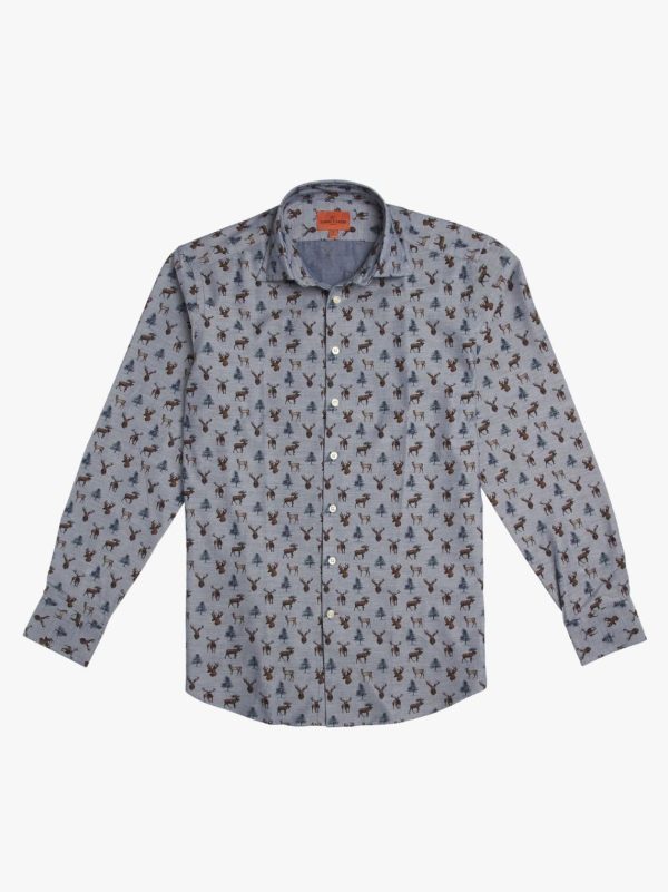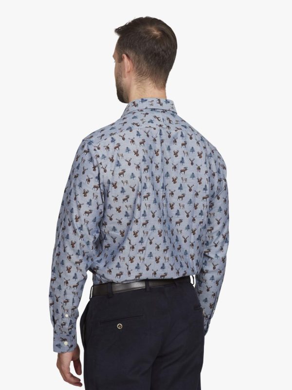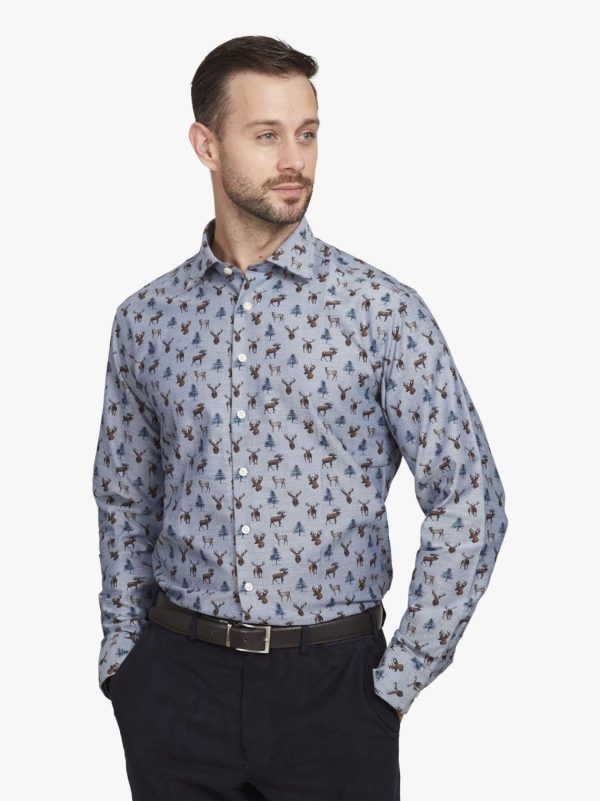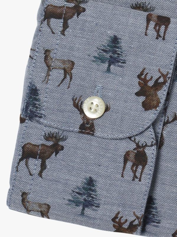 Ah, the noble deer. Monarch of the Glen, or destroyer of crops, depending on whether stalk or farm. Either way, there’s a touch of the baronial hall about this shirt with its mounted stags heads and skittish Muntjac. One or two seem to be eyeing each other up. Possibly its the rutting season. We’ve printed this on a super fine poplin for added texture and the browns and blues make a lovely autumnal pairing. Made on our most casual block it features rounded cutaway cuffs and flat front. Gently tailored.