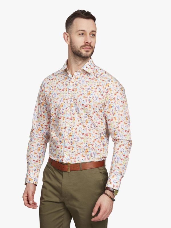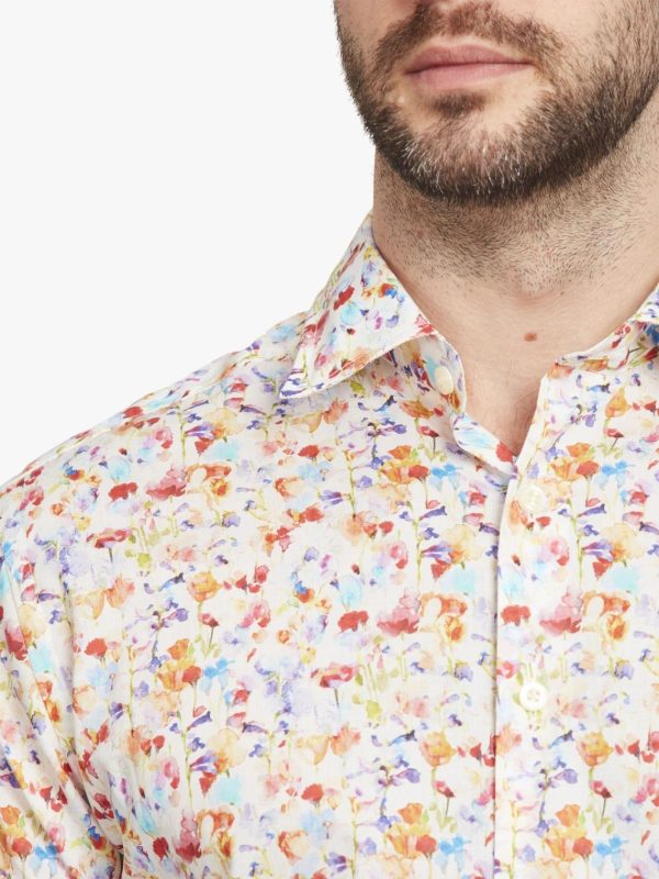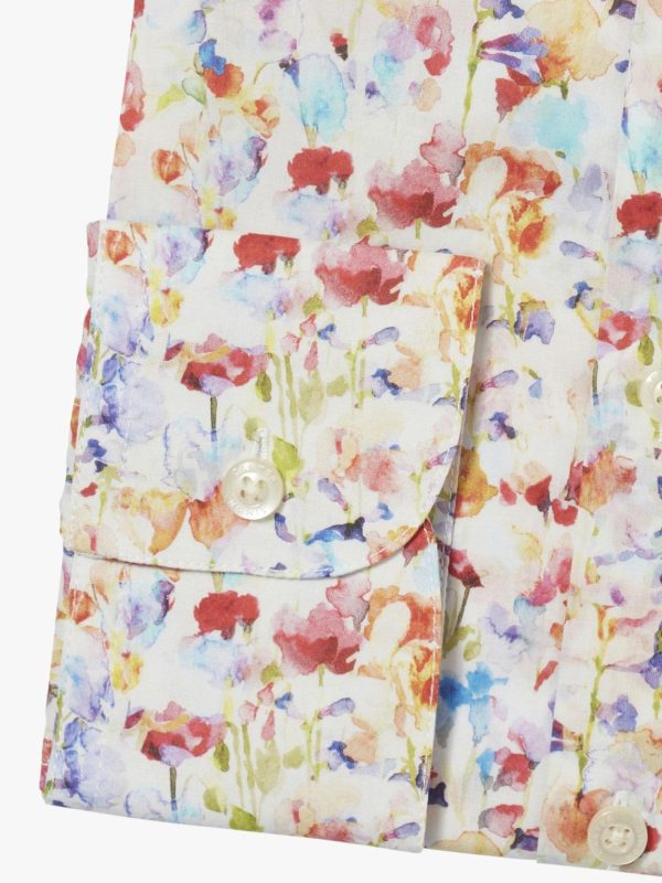 Here’s a classic floral design that will never go out of style. Its Made with Liberty fabric and features their clever use of delicacy and colour. That sense of casual, quick water colour painting is very hard to achieve, but here they’ve made it look so easy. The indigo hues make this perfect with crisp shorts and blue linen jacket for relaxed elegance. We’ve cut this on our more casual Clift block, with flat front and cutaway cuffs. Gently tailored.