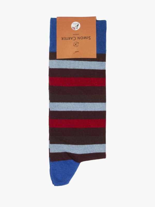 This vivid thin striped sock from Simon Carter features a Canatas design with blue, grey and red to liven up any look. Made In England with 60% cotton for breathable comfort.