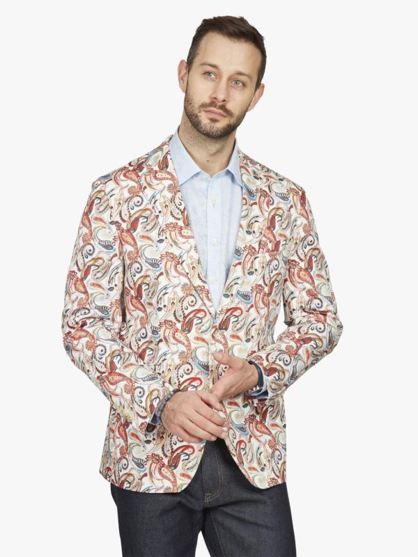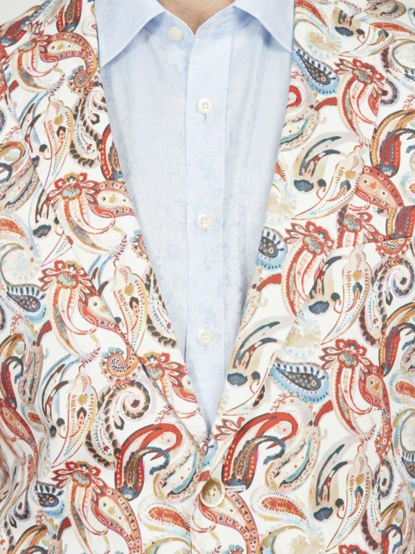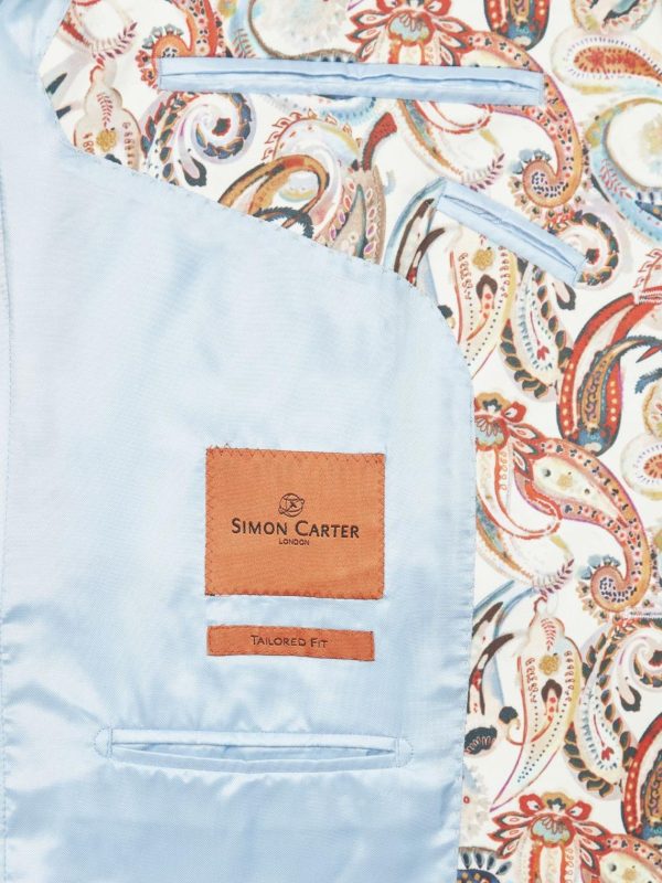 It’s hard to strike the balance between statement and wearability but this jacket does that very well indeed. The white background allows all the colours to stand out, and for the tendrils and ogees to be clear, with their delicate forms at once so familiar and exotic. The pale blues, subtly placed throughout the design, allow this jacket to work so well with linen trousers or, for a more casual look, jeans and loafers. Its tailored, so there’s a smartness to it, with a vivid electric blue lining. The composition is 97% cotton with 3% elastane so theres a comfortable stretch to the fit.