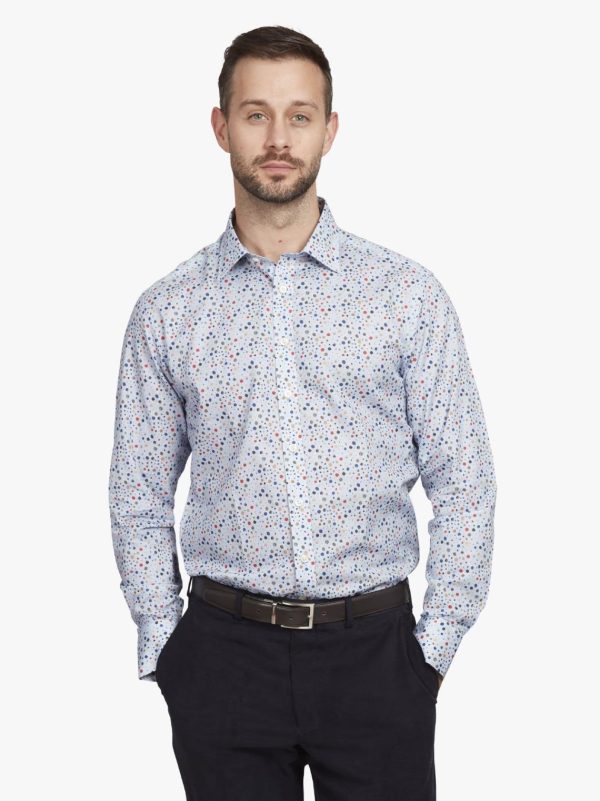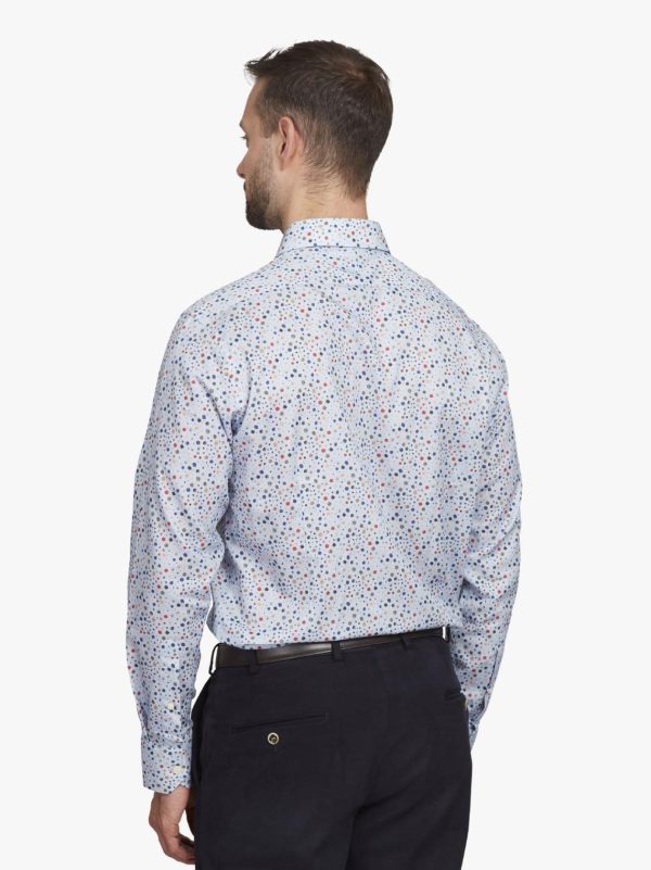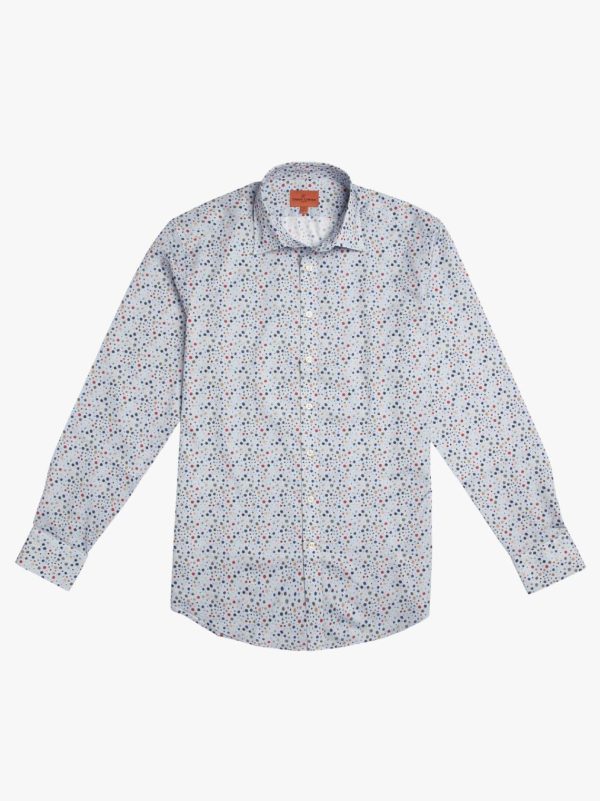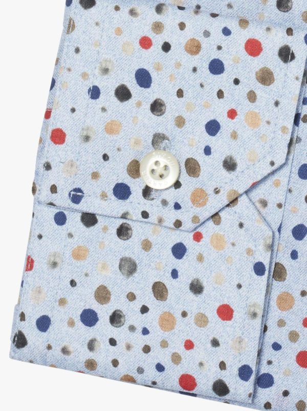 Don’t be deceived by the apparent randomness of this design; a great deal of care went into ensuing the dots are carefully spaced, and the sizes aren’t bunched. The fabric has a lovely, slightly brushed feel, producing almost a vintage effect. The pale blue ground makes this work with any of your wardrobe favourites. Wear with a khaki or red knitted silk tie for that slightly posh neighbour’s drinks party, or with jeans to relax by the fire at home. Made with cutaway cuffs and removeable collar stiffeners. Gently tailored.