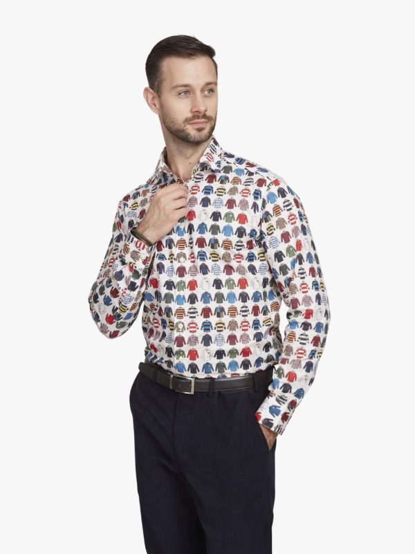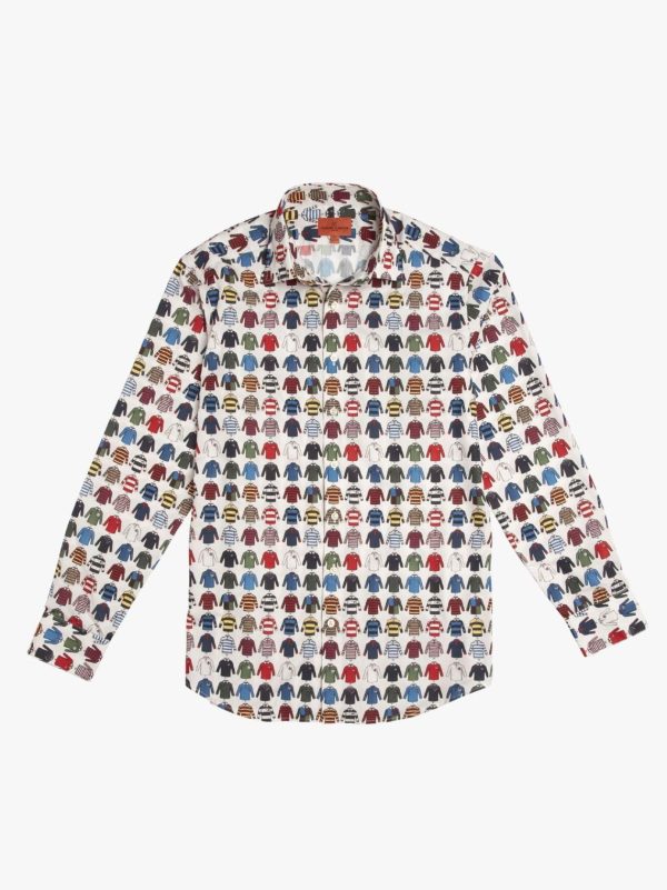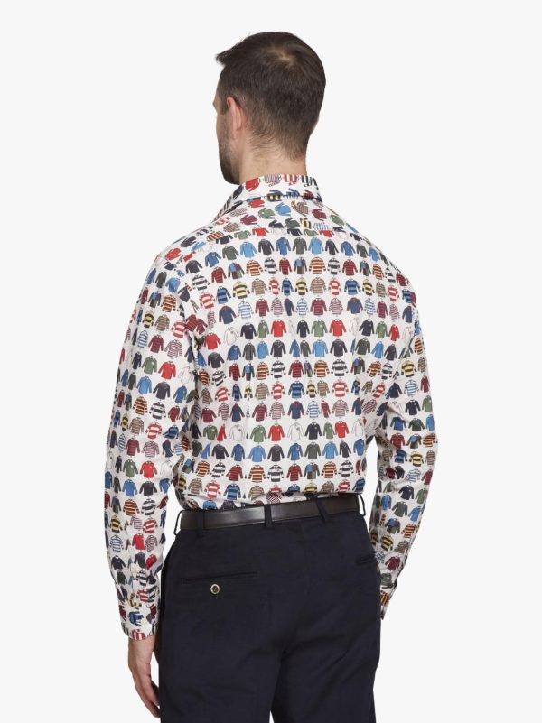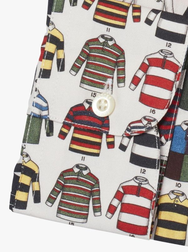 At school I was moderately good at rugby. Because of the way my birthday fell in September, I was bigger than most of the other boys and so could barrel though them like skittles. Vintage sports shirts always have an appeal; that combination of functional design and hard-wearing fabric that soften so well. This shirt celebrates the huge variety of colourways and designs. Give us a shout if you recognise yours. Weve made this on our most casual block, with curved cutaway cuffs and flat front. Made in Portugal from 100% cotton.