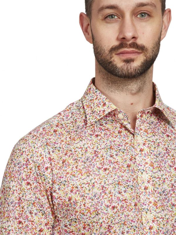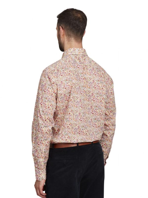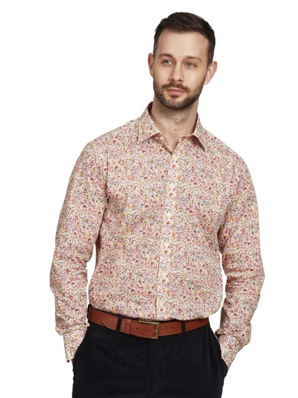 Can you see the sea? The inspiration for this highly detailed design comes from the ferocity of sea spray and breaking waves. Made with Liberty fabric, it was created by melting shavings of coloured wax crayons, apparently. Personally, it reminds me of the work by Seurat, the pioneer of Pointillism but I have been unable to make out any pastoral scenes when holding the shirt at a distance. Either way, there’s an easy versatility to this, with so many colours involved there’s no excuse. I’d wear my green chinos and a sharp blue linen jacket. Perfect anywhere. Cut on our more casual block with cutaway cuffs. Gently tailored.