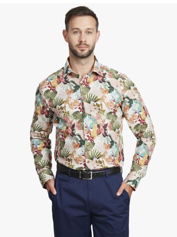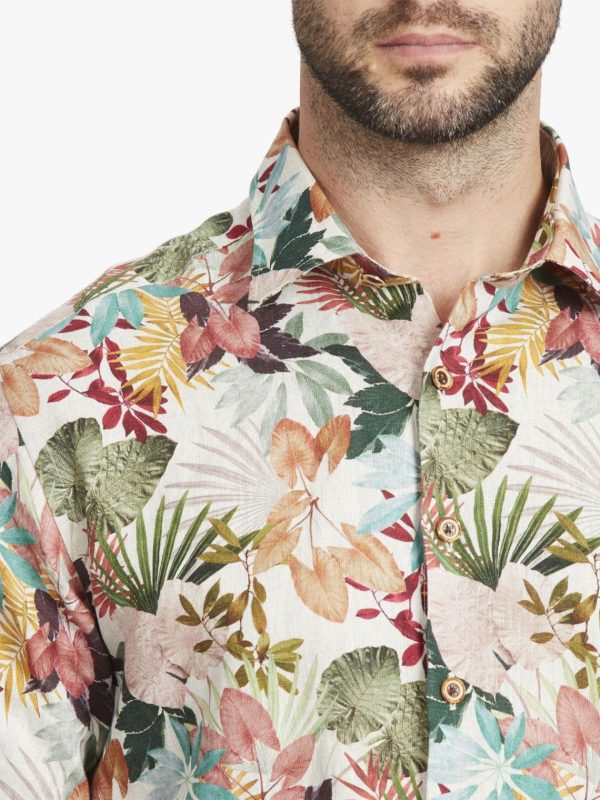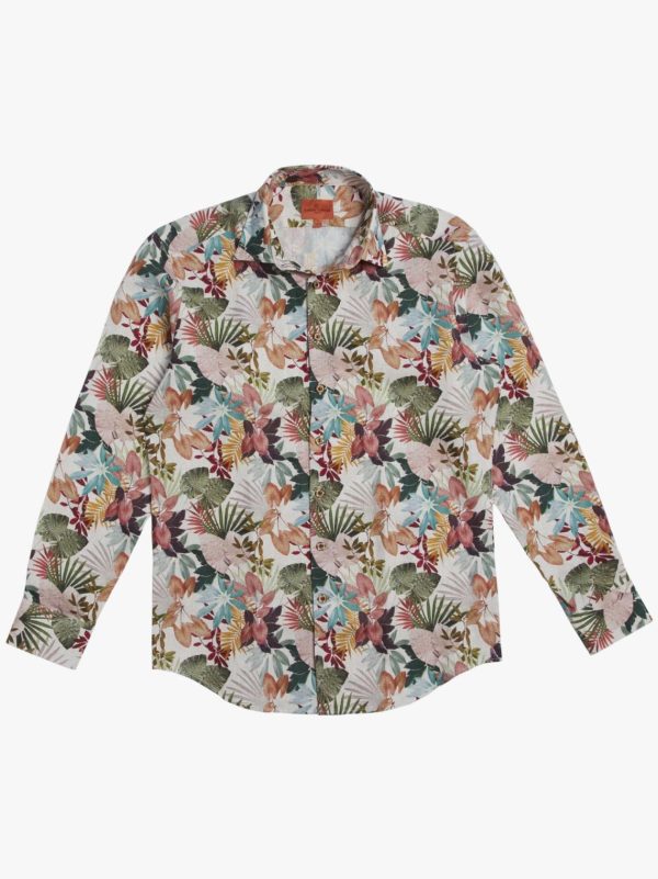 Discover the perfect linen shirt that only gets better with time. This exceptional piece develops a beautifully soft texture with each wash, embracing that perfectly broken-in feel that makes linen so special. The stunning tropical palm print features rich emerald greens and deep plum tones that create striking visual depth with layered foliage details. Cut for ultimate casual comfort, this shirt features our relaxed fit design with rounded cuffs and coordinating buttons for a polished yet effortless look.