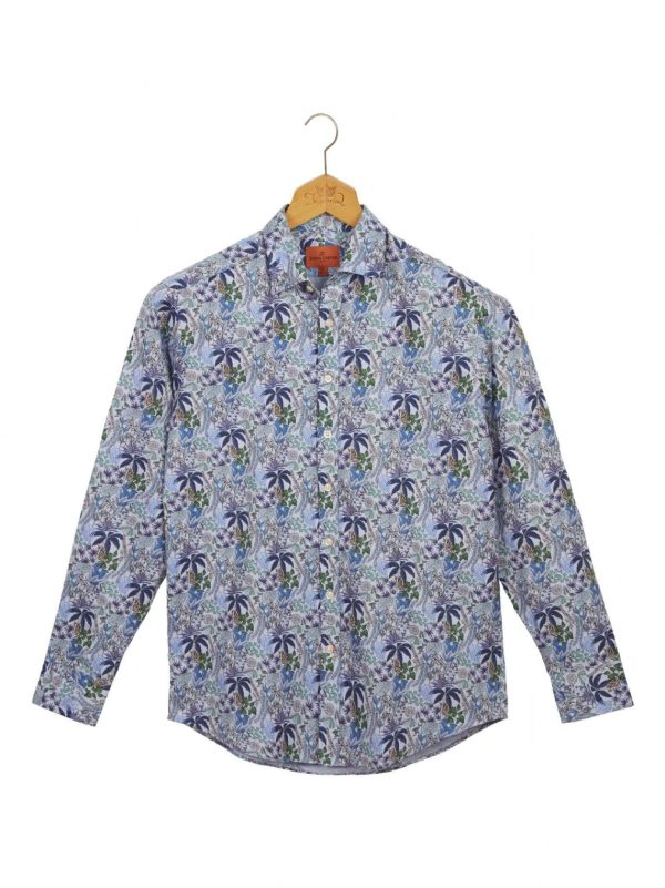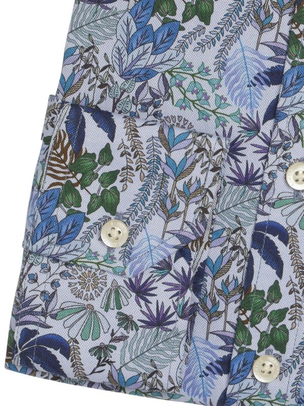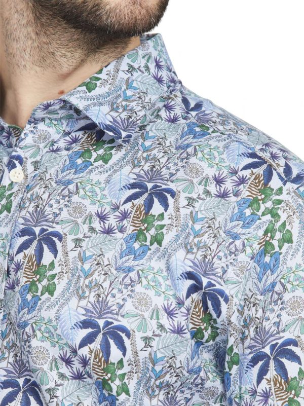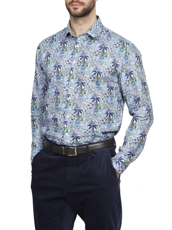 Experience the exceptional quality of premium Oxford poplin that only gets better with time. This sophisticated shirt draws inspiration from the legendary Kew Gardens conservatories, featuring an elegant tropical motif of striking palm fronds intertwined with lush ferns and exotic blossoms. The refined color palette creates a versatile blue base with vibrant green accents that adds a touch of sophistication to any outfit. Made from 100% cotton with a gently fitted block. Cutaway cuffs and removeable collar stiffeners.