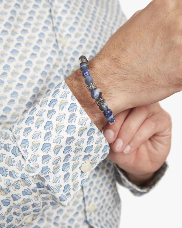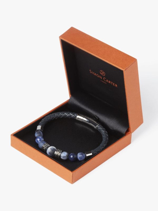This sophisticated men’s bracelet features a premium woven leather band complemented by alternating varieties of genuine sodalite stones – including classic white and navy variations alongside striking blue-toned pieces. The design incorporates two sculpted metal bands with distinctive black-accented front detailing. At the center rests a larger, matte-finished sodalite bead that adds a touch of rugged elegance. Secured with our reliable trigger clasp mechanism, this bracelet combines mineral power with the durable strength of leather and metal components for a statement piece that transitions effortlessly from day to night.