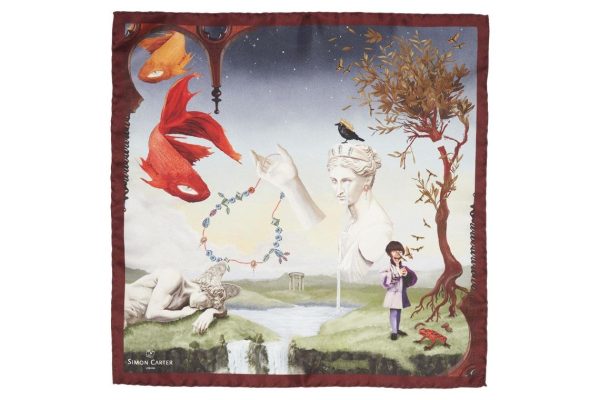 Some might see Salvador Dali influences; others might marvel at the artist’s visionary approach. Personally, we’re thrilled to present this exceptional addition to our premium silk pocket square collection. Designed in-house by our Senior Designer, the brilliantly creative Frederick. Imagine a surreal landscape where a child sings beneath circling koi carp while a distinctive olive tree overlooks a dreamlike scene. Rest assured, Frederick’s artistic vision results in pure sophistication.