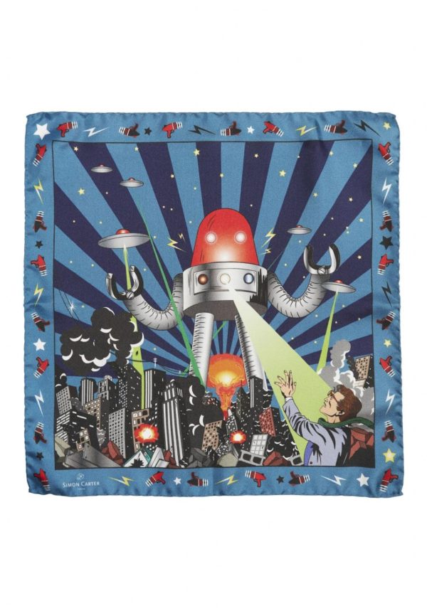Retro sci-fi fun as a giant alien robot wreaks havoc on puny earthlings with his lime green ray of death! Elsewhere hostile flying saucers are engaged in the same apocalyptic project. This is an original artwork produced in the fevered creative hot house that is Carter Towers. Pure silk pocket square, approximately 13 inches by 13 inches
