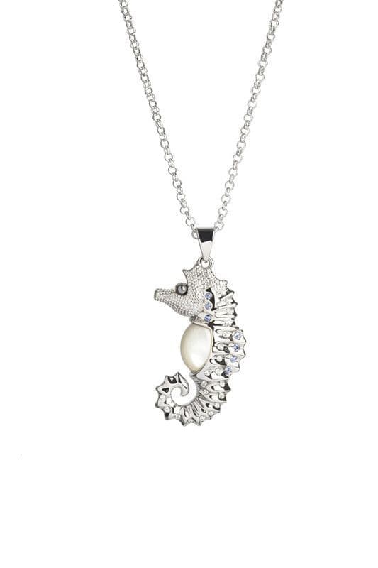 A platinum plated seahorse pendant with a central piece of Mother of Pearl and clear and blue Swarovski crystals on 30″ chain with 2″ extender.