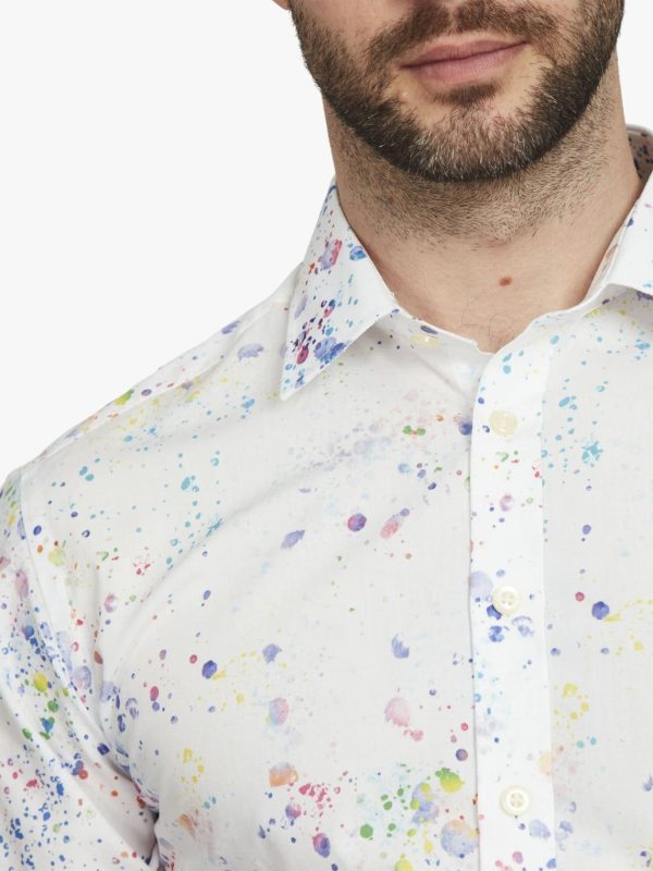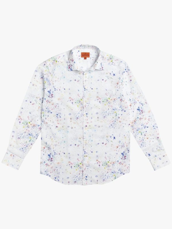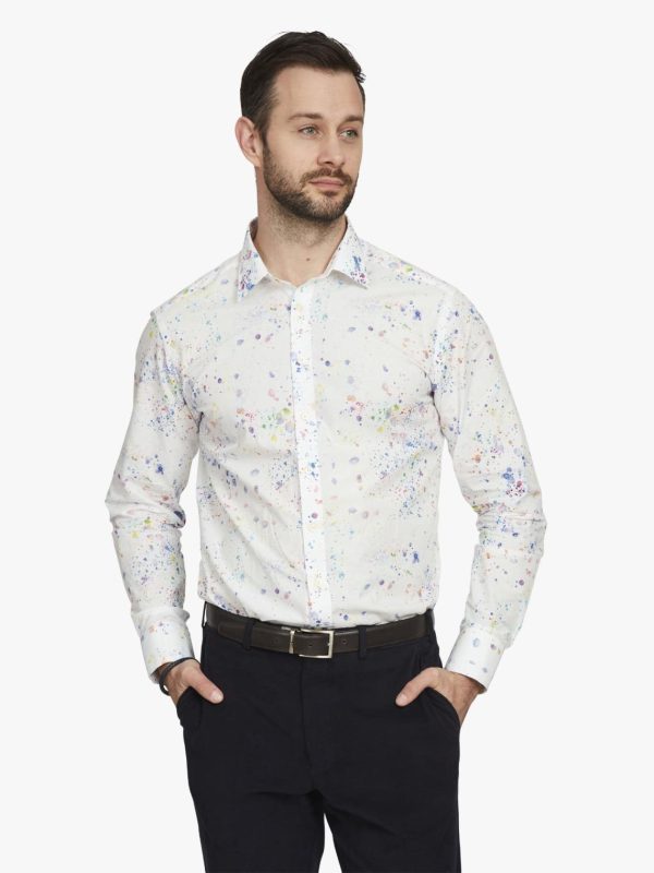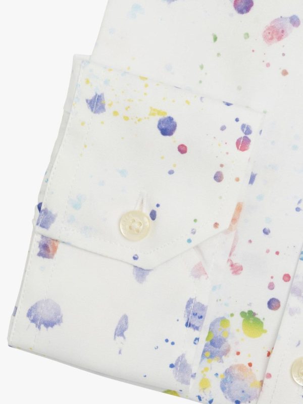 Remember flicking paint when you were a child? Well, so do we. Here’s a nostalgia trip to messing about with your watercolour paint box aged five and a half. There’s more to this than meets the eye; creating a deliberate sense of randomness is harder than you think. We spent a long time on the size and spacing of the splats, ensuring that the primary tones of blue were counterbalanced by secondary tones of lime green and yellow. The end result is a shirt that’s both fun and wearable. Made with removeable collar stiffeners, and gently tailored.