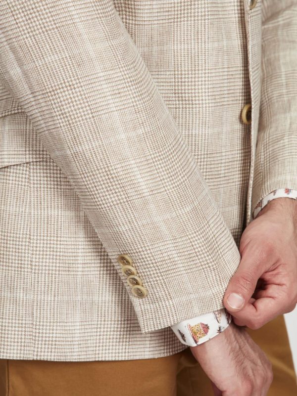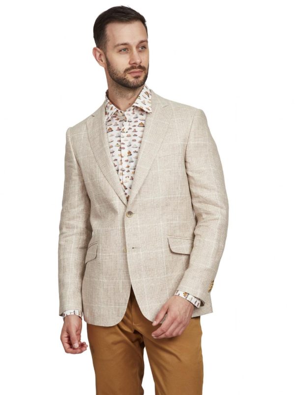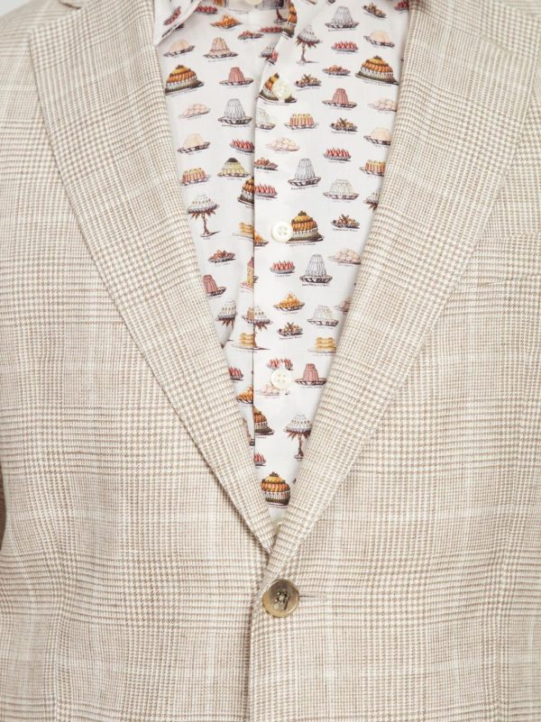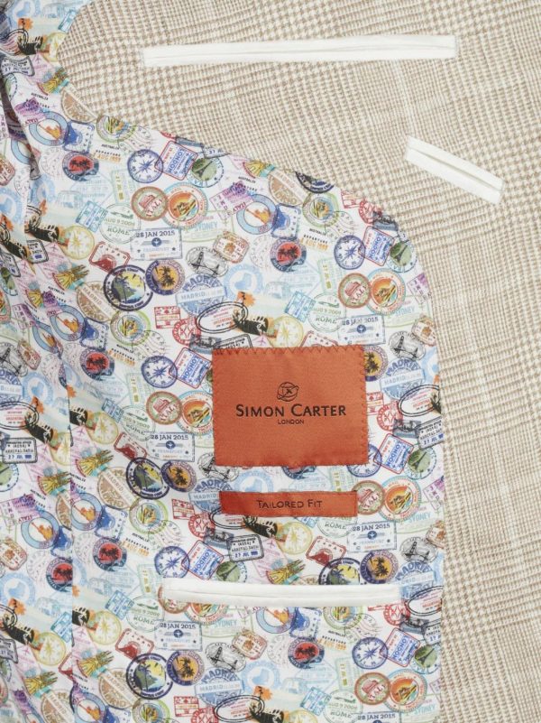 All set for summer? No? Well, you’ve come to the right place. Here’s a lovely twist on the classic Prince of Wales check. The fabric is 100% linen, from Italy’s famous Angelico mill. Its lined with this seasons signature print of vintage travel stamps and features a relaxed structure with soft shoulder for an easy versatile look. The muted palette of cream and pale beige work well with so many pieces in your wardrobe. Team with chinos and a white linen shirt.