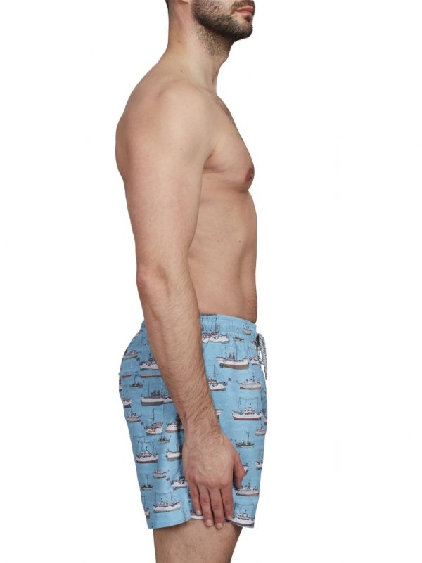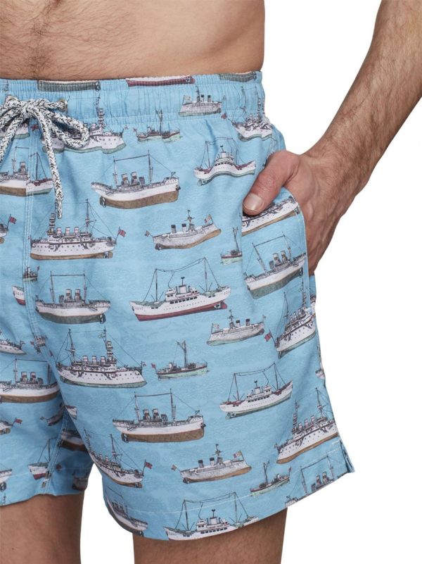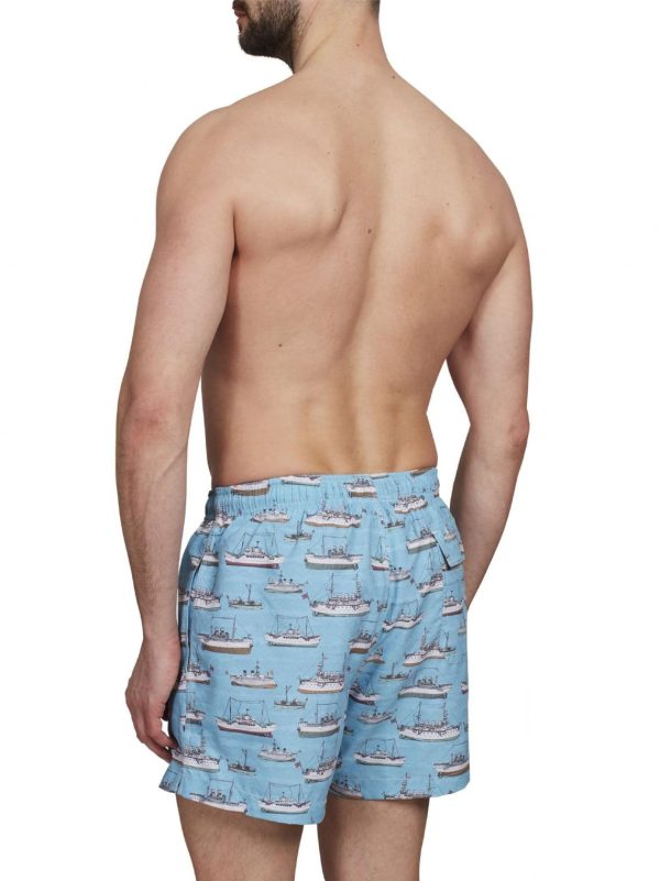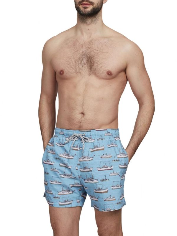 Here’s a veritable armada of boats waiting to dock at Port Carter. The fact that some are out of the water, and some in, give the print a charming surreal touch. Its a ship spotters dream. This rich design is printed onto 100% recycled polyester. Apart from doing good by the planet, it has a lovely soft feel and those clever fabric boffins have designed it to be super quick drying. There’s a handy inner mesh to protect your assets and the tech even extends to allowing the swim shorts to breathe so there’s no unsightly ballooning if you know what I mean. Our swim shorts are just that; perfect for both poolside and bar side. There are two pockets at the font and a nifty Velcro pocket at the back to keep your other assets safe, too.