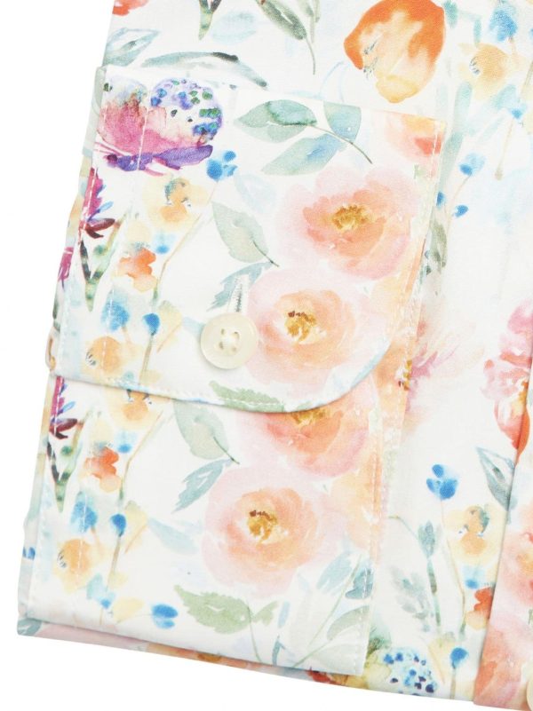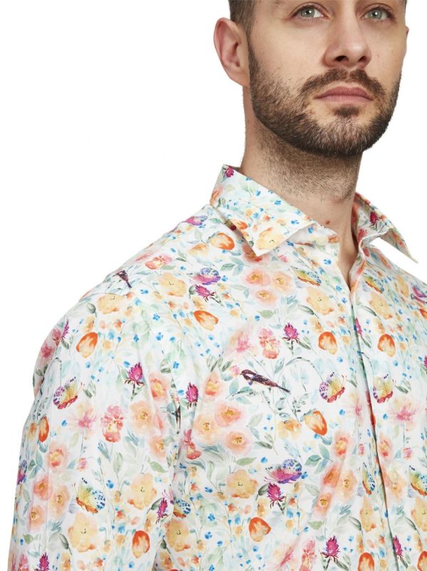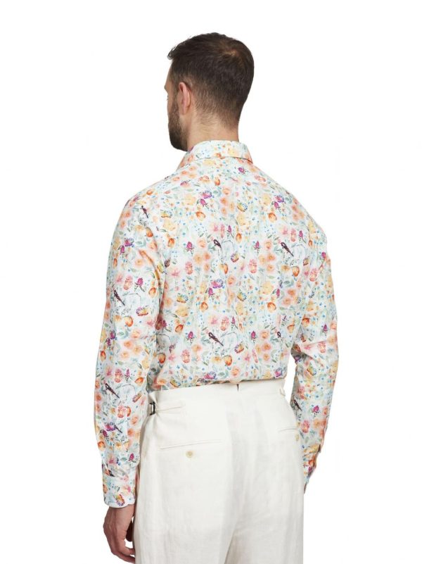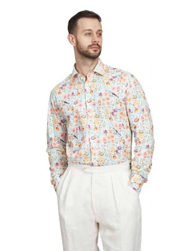 There’s an easy delicacy to this design that is so appealing. The soft watercolour flowers are done with the lightest of touches, and the butterflies are almost part of the design. It’s very charming and its white background makes it a great choice for so many occasions. Roll up the sleeves, pair with shorts and loafers and you’re good to go for the neighbours barbeque. Equally, chinos and a blue blazer, and you’re wedding ready. Choose from subtle multi coloured, or a more muted essay in tonal blues. We’ve used our more casual Clift block with a softer cut away collar and cuffs. Made with a gently tailored fit.