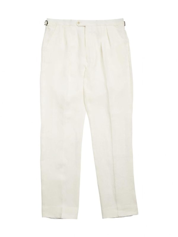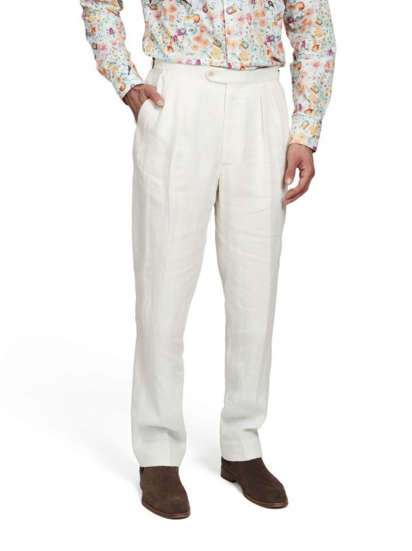 Pleats! Yes, they’re back. Two of them to be precise. Think Robert Redford in The Great Gatsby. Easy, effortless style. Ours are made from 100% Italian linen, half lined for comfort, and with snazzy side adjusters so you don’t need to fuss about with belt loops. Another nice vintage touch. There are two rear pockets with buttons, and at the front, the two main pockets are complemented by a secret little hideaway for tickets or who knows what else. The vintage feel continues inside with a split rear waistband and contrasting ticking lining. These really are on the money for this summer.the cravatte is up to you.